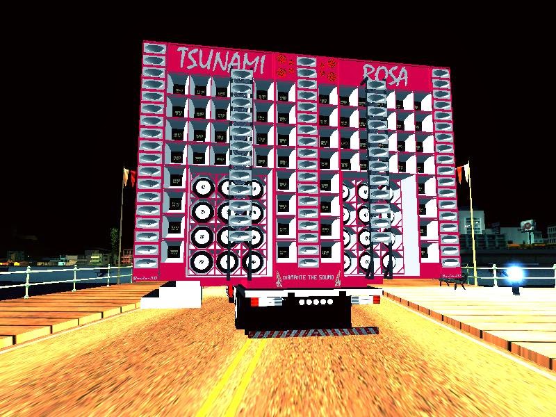 :Caminhão Tsunami Rosa que era uma carretinha e fiz uma adaptação para um caminhão e coloquei gaiola de palco que o CeeJay (CJ) consegue subir até lá